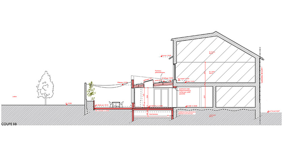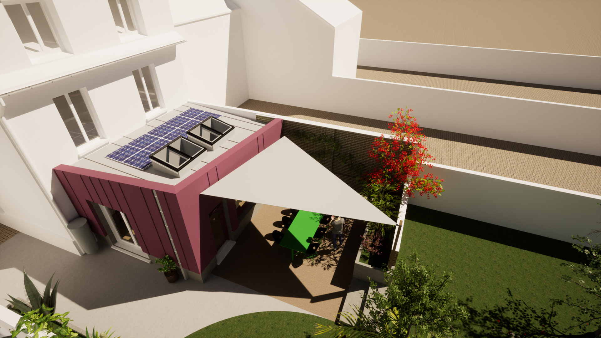 D’un point de vue technique, peu de difficultés : les dimensions et proportions de l’extension restent dans les standards. Cela nous permet de gérer le budget de la construction et de bénéficier d’une bonne disponibilité des matériaux. Seule la pose de panneaux photovoltaïques en toiture devait être prise en compte dans le dimensionnement de la charpente, car elle crée une charge permanente supplémentaire.