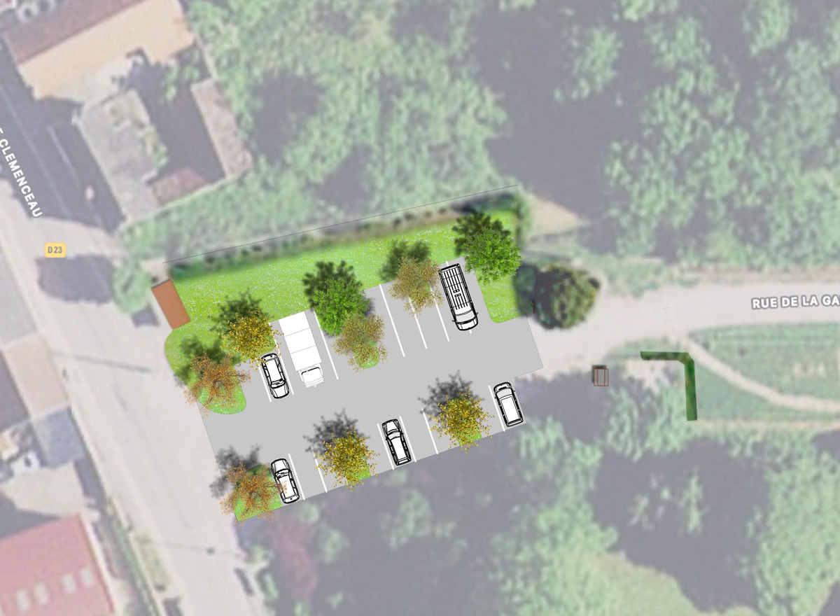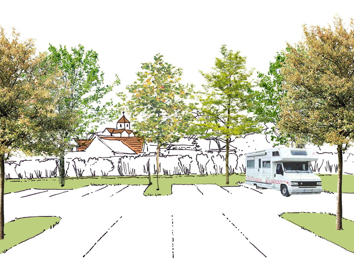En complément de la halle, la commune a commandé la requalification du parking existant. J’ai collaboré pour cela avec Mme Arianne Smythe, paysagiste de l’agence Métamorphose.