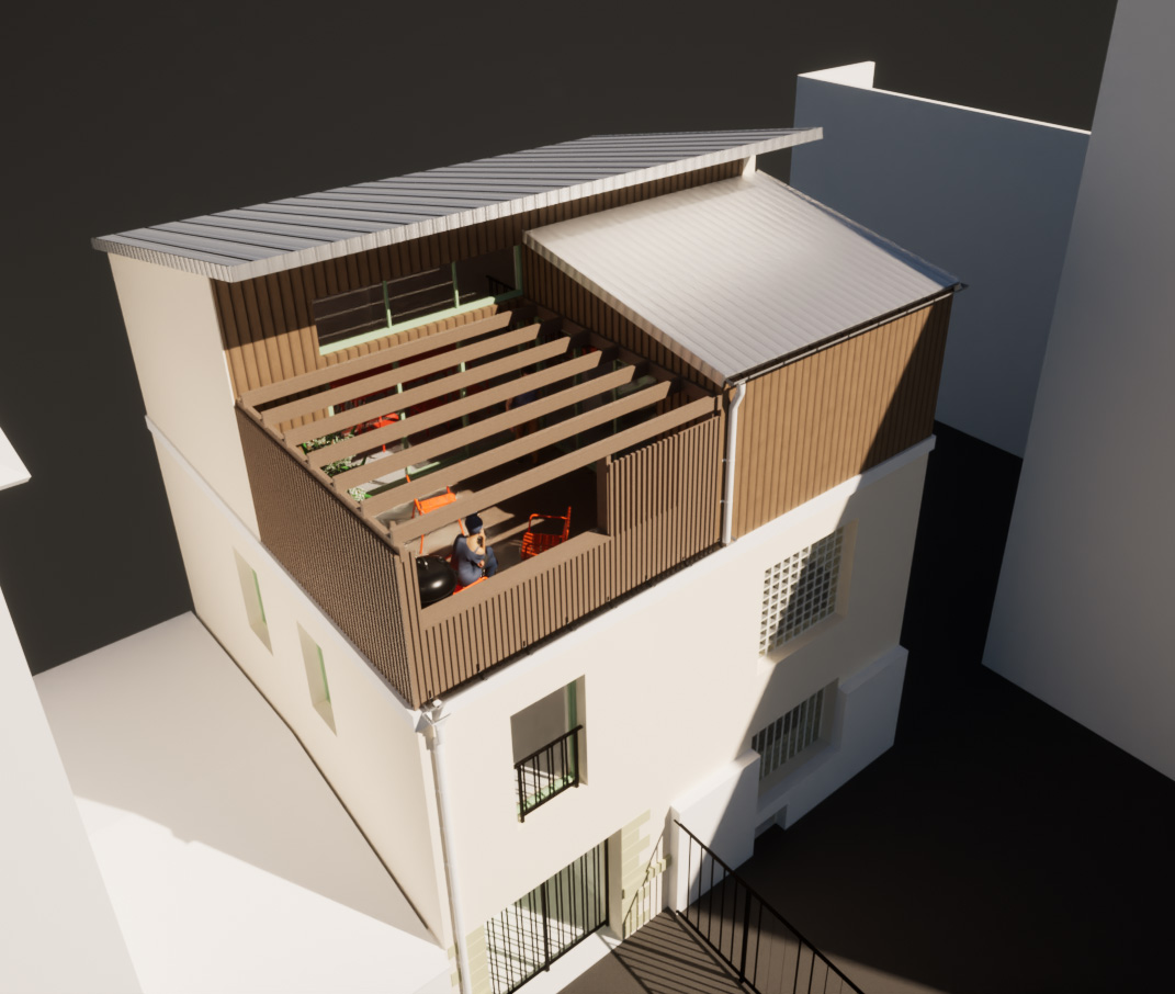 La surélévation en L s’implante sur les murs périphériques du bâtiment existant. Pour s’intégrer harmonieusement dans l’environnement proche et limiter minimiser l’impact visuel du projet, le volume des toitures adopte des formes simples, avec une mono-pente pour chaque espace.