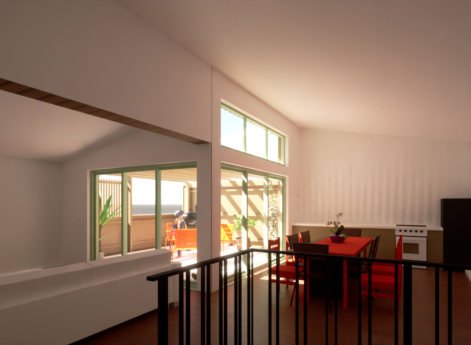 Les pièces de vie se situeront en attique. La cuisine-salle à manger et le salon formeront un L autour de la terrasse orientée plein Ouest, créant des espaces lumineux et agréablement ouverts.