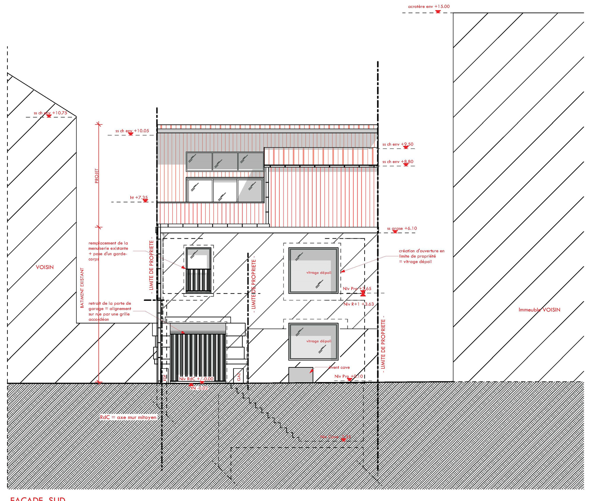 La rénovation et la transformation se concentrent sur le rez-de-chaussée et le premier niveau. Le projet inclut la création de nouvelles ouvertures. Celles-ci nécessitent des demandes spécifiques puisqu’elles donnent sur la cour de l’immeuble voisin. Elles seront traitées de manière à laisser rentrer la lumière dans le bâtiment sans pour autant créer de vues sur la propriété mitoyenne.